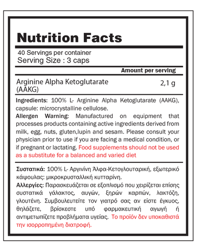 Το AAKG είναι ένα βιοχημικό στοιχείο το οποίο φτιάχνεται από δύο μόρια L-αργινίνης, συνδεδεμένα με ένα μόριο αλφα-ketoglutarate. Η μορφή αυτή έχει υψηλή βιο-διαθεσιμότητα που σημαίνει ότι απορροφάται και λειτουργεί καλύτερα απ’ ότι η σκέτη L-αργινίνη. Η αργινίνη είναι ένα αμινοξύ που παράγεται στο σώμα και παίζει σημαντικό ρόλο στη διατήρηση της καλής καρδιαγγειακής λειτουργίας, καθώς λειτουργεί ως προδρομος για τη σύνθεση του νιτρικού οξειδίου(Ν.Ο.). Το νιτρικό διαστέλλει και χαλαρώνει τις αρτηρίες, κάτι το οποίο όταν γυμνάζεστε σημαίνει ότι περισσότερο αίμα, οξυγόνο, αλλά και θρεπτικά συστατικά μεταφέρονται στα μυϊκά κύτταρα.