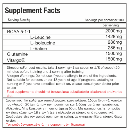 Δοσολογία: Για καλύτερα αποτελέσματα, καταναλώστε 1 δόση 5γρ. (=1 κουτάλι του γλυκού) 20 λεπτά πριν την προπόνηση και 1 δόση μετά την προπόνηση.