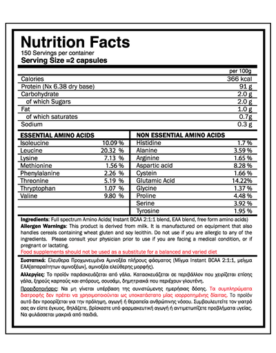 - 1 μερίδα (2 χάπια full spectrum AMINO) αμέσως μετά την προπόνηση για να μεγιστοποιήσετε την αποκατάσταση