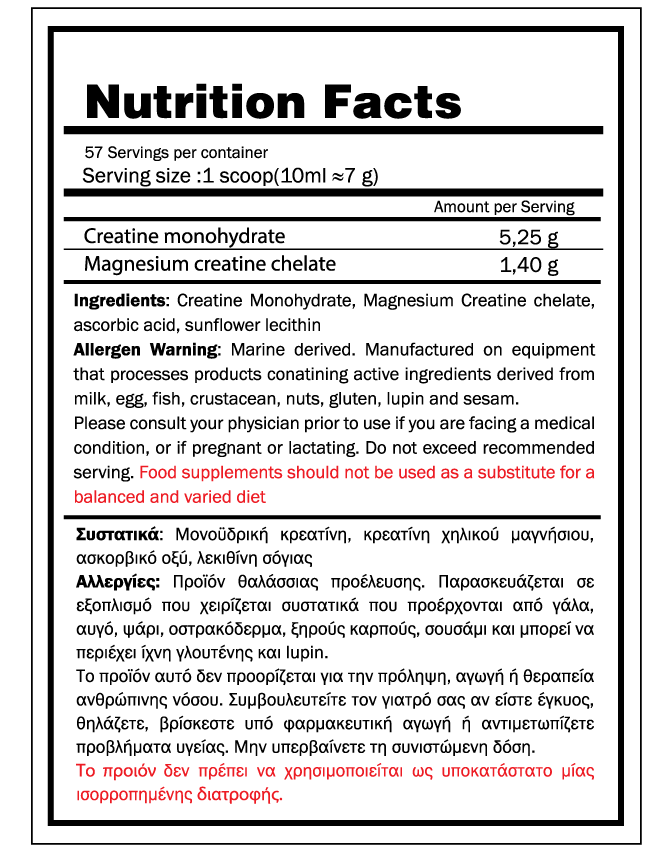 & κρεατίνη χηλικού μαγνήσιου η οποία είναι ένας συνδυασμός Μονοϋδρικής Κρεατίνης και Μαγνησίου σχεδιασμένος ώστε να αυξάνει τη σωματική απόδοση. Το μαγνήσιο συμβάλλει αποτελεσματικά στη φυσιολογική μυϊκή λειτουργία και στη φυσιολογική σύνθεση της πρωτεΐνης