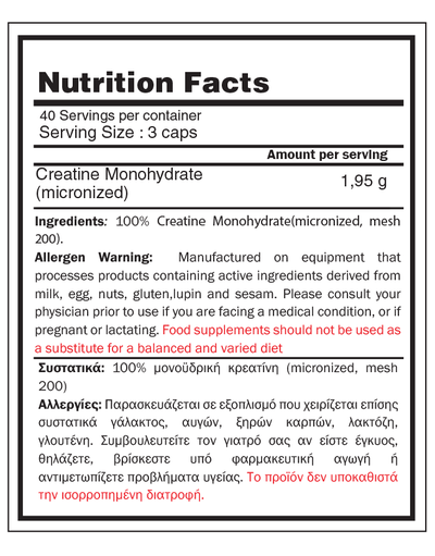 Σημ: Μην καταναλώνετε πολύ κοντά με καφέ ή άλλο ποτό που περιέχει καφεΐνη. Πίνετε λίγο χυμό ή καταναλώνετε μαζί με μια άλλη πηγή υδατανθράκων, προκειμένου να προωθήσετε την απορρόφηση κρεατίνης. Η μονοϋδρική κρεατίνη είναι κατάλληλη για χορτοφάγους και ανθρώπους που δεν καταναλώνουν αρκετό κρέας μέσω της διατροφής τους.