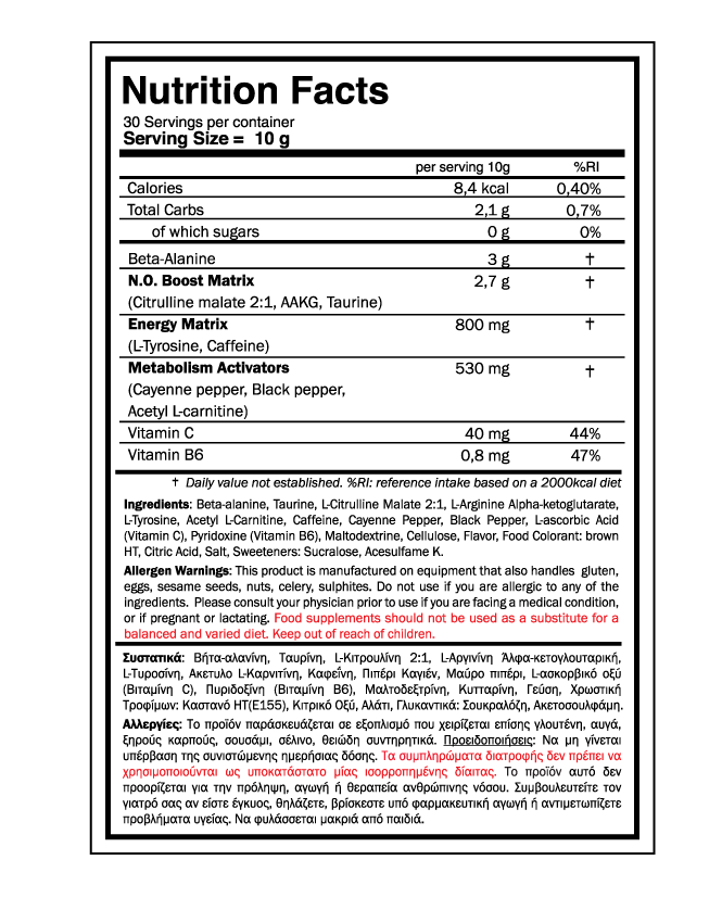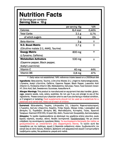 Περιέχει AAKG και Citrulline Malate, συστατικά τα οποία προκαλούν αγγειοδιαστολή και καλύτερα μυϊκά pumps. Αυτό σημαίνει ότι περισσότερο οξυγόνο, αμινοξέα και άλλα θρεπτικά συστατικά μπορούν να φτάσουν άμεσα στα μυϊκά κύτταρα, καθώς προπονείστε. Διεγερτικά & τονωτικά συστατικά όπως η Ταυρίνη, η Καφεΐνη και η Τυροσίνη τα οποία σας βοηθούν να αισθάνεστε γεμάτοι ενέργεια, βελτιώνουν την αντοχή σας, αλλά και την εστίαση στην άσκηση.