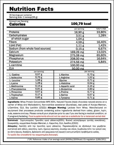 Τέλος περιέχει κλινικές δόσεις από συζυγές λινελαϊκό οξύ (CLA) και καρνιτίνη που ενεργοποιούν τον μεταβολισμό και ανεβάζουν τα επίπεδα ενέργειας, βοηθώντας ουσιαστικά με τον τρόπο αυτό την προσπάθεια σας για γράμμωση και απώλεια λίπους.
