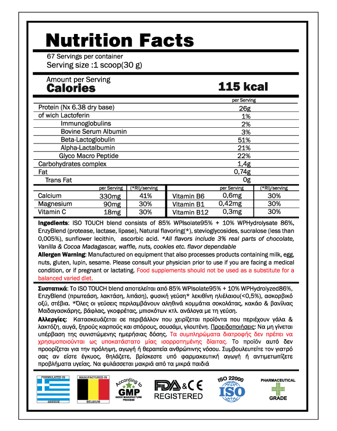 H ISO TOUCH premium protein blend είναι η πιο υψηλής ποιότητας, καθαρή και βιολογική πρωτείνη που μπορείτε να καταναλώσετε. Εγγυόμαστε ότι κάθε μπουκάλι της ISO TOUCH παρασκευάζεται με πρώτη ύλη γάλα που προέρχεται από αγελάδες που τρέφονται με χορτάρι και χωρίς ορμόνες. Όπως σε όλα μας τα προϊόντα έτσι και στην ISO TOUCH οι διαδικασίες παραγωγής υπόκεινται σε τακτικούς ελέγχους και υπακούει σε υψηλά standard ποιότητας.
