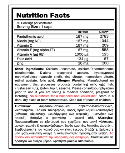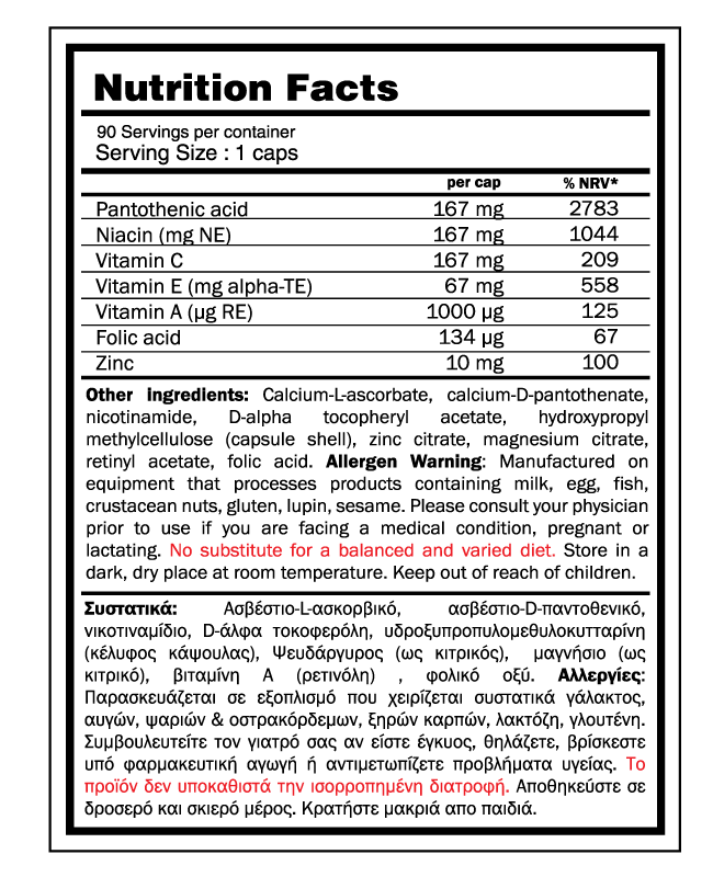 Έχει υψηλή συγκέντρωση Παντοθενικού οξέος ( υδατοδιαλυτή βιταμίνη του συμπλέγματος Β). Συμμετέχει στη σύνθεση του συνενζύμου Α, το οποίο είναι απαραίτητο για όλους τους ιστούς του σώματος καθώς ξεκινά τον κύκλο παραγωγής ενέργειας του Krebs. Επομένως βοηθά στην την αξιοποίηση των βιταμινών και στη μετατροπή των λιπών, υδατανθράκων & πρωτεϊνών σε ενέργεια. Επιπλέον, το παντοθενικό οξύ συμβάλλει στη φυσιολογική σύνθεση και μεταβολισμό των στεροειδών ορμονών και εμπλέκεται επίσης στη σύνθεση ορισμένων νευροδιαβιβαστών του εγκεφάλου καθώς και των αντισωμάτων. Επιπλέον, το Adreno Support περιέχει ψευδάργυρο που βοηθά στη διατήρηση ενός φυσιολογικού επιπέδου τεστοστερόνης, βιταμίνη C και νιασίνη που επίσης υποστηρίζουν τον μεταβολισμό της ενέργειας.