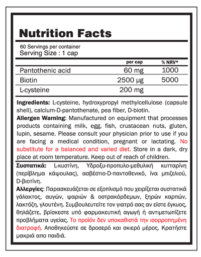 Η L-κυστίνη η οποία είναι σημαντική για τη σύνθεση κερατίνης, του κύριο συστατικού των μαλλιών, ενώ συμβάλλει στην αποτοξίνωση του ήπατος και των κυττάρων.