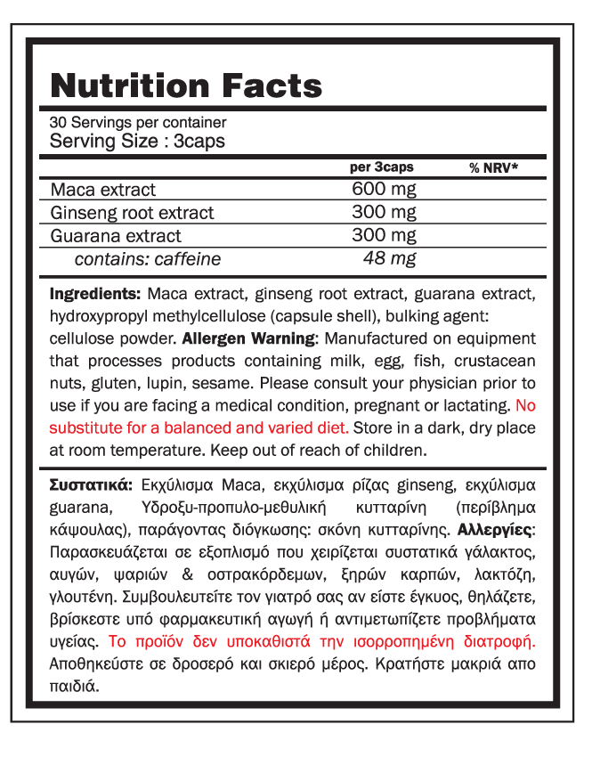 To Maca Energy περιέχει φυτικό εκχύλισμα του διάσημου φυτού από το Περού, τζίνσενγκ και γκουαρανά. Τα θρεπτικά οφέλη της ρίζας Μάκα είναι αδιαμφισβήτητα καθώς είναι πλούσια σε σίδηρο, ασβέστιο, μαγνήσιο, αμινοξέα, βιταμίνες και μέταλλα. Σε συνδυασμό μάλιστα με τα εκχυλίσματα ginseng και guarana, το Maca Energy αποτελεί το απόλυτο δυναμωτικό: