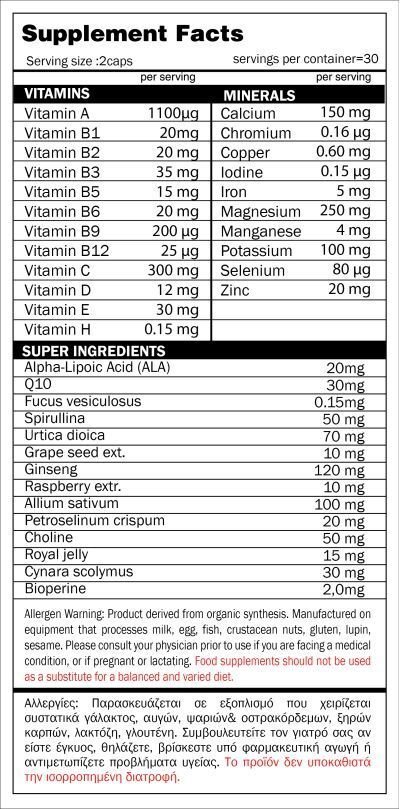 Επίσης ενισχύει τον οργανισμό σας μια καλή δόση ασβεστίου, σιδήρου, ψευδάργυρου, μαγνησίου, καλίου, ιωδίου και άλλων μετάλλων. Επιπλέον στο ανανεωμένο MVC έχουν προστεθεί superfoods όπως βασιλικός πολτός, ALA, σπιρουλίνα, ginseng, εκχύλισμα από σταφύλι και raspberries κτλ. τα οποία συμβάλλουν στην καλή λειτουργία του ανθρώπινου οργανισμού.